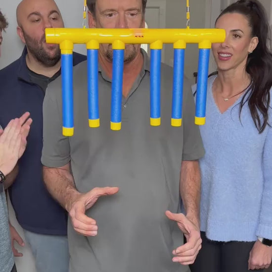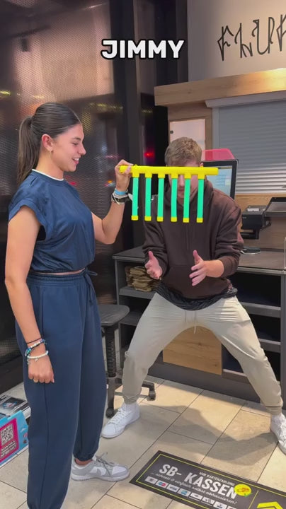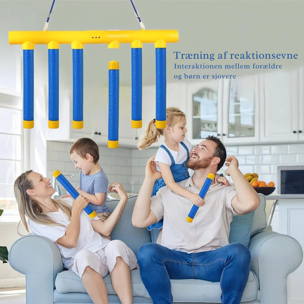 Stå under apparatet og forsøg at gribe så mange stave som muligt, mens de falder ned i tilfældig rækkefølge.